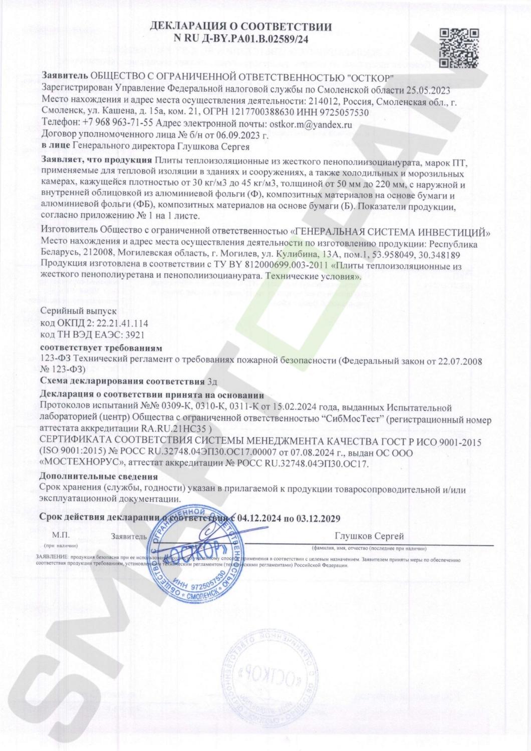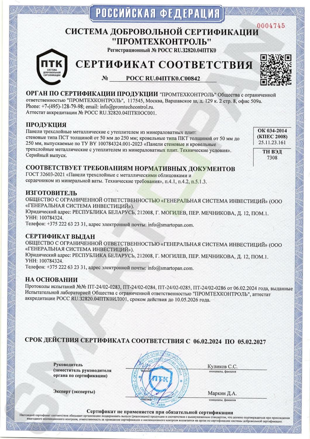 Стеновые и кровельные сэндвич-панели SMARTOPAN с теплоизоляционным слоем из минеральной ваты на основе базальтового волокна и пенополиизоцианурата (PIR) имеют высокие показатели по огнестойкости и пожарной безопасности, что подтверждено соответствующими сертификатами государственных организаций Республики Беларусь и Российской Федерации.